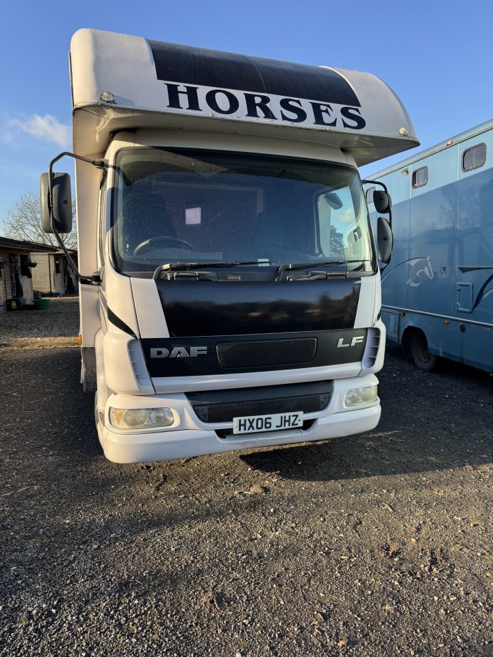 DAF 45 06 plate for sale. Lovely box to drive, good condition. Need new panel under windows in Horsebox section. Travels 3, has plenty of skirt lockers. Living has fridge, gas hob and sink. Outside locker in horse area. 240v hookup. Reverse camera and camera in horse section. Mot runs out in January, open to sensible offers. Quick sale needed as have already brought a larger box.