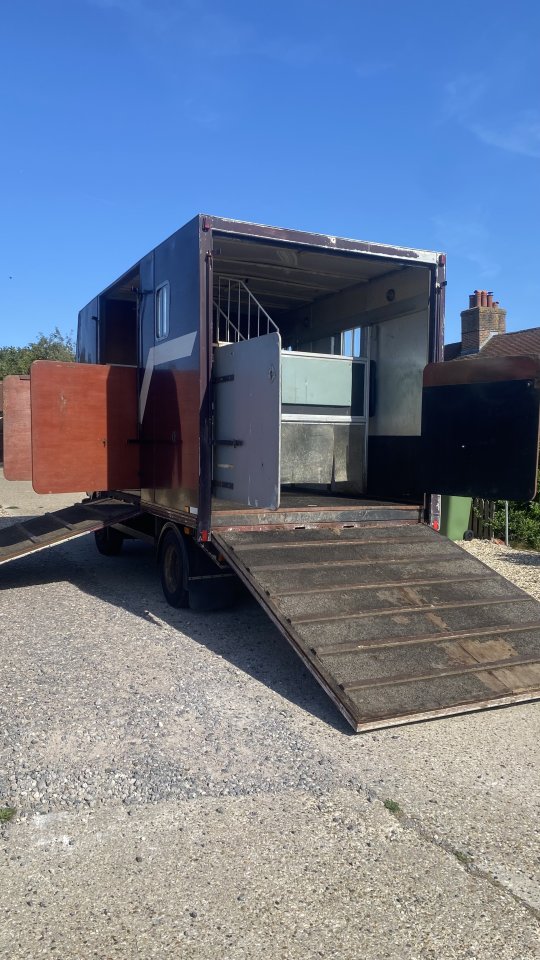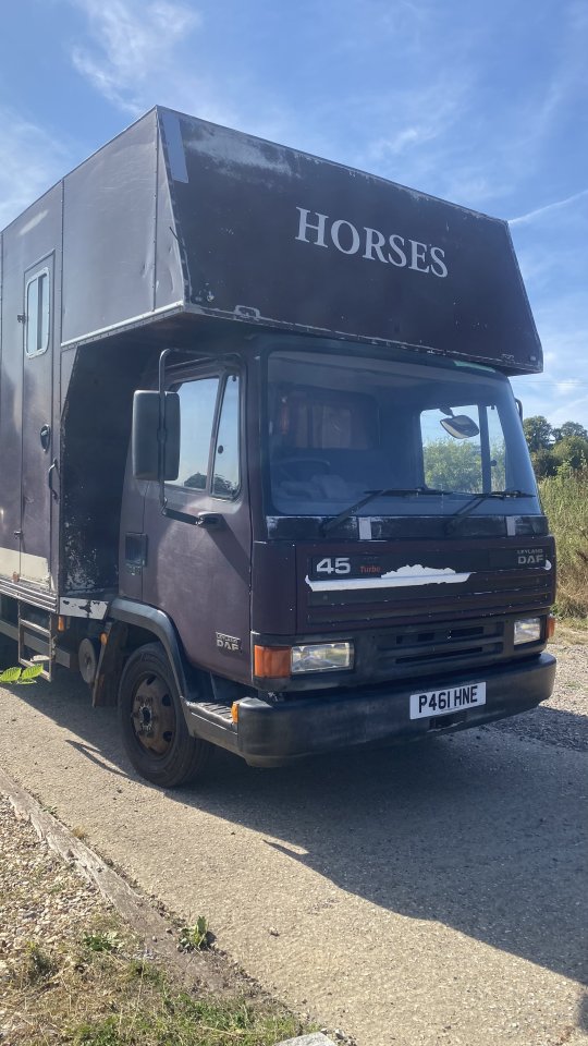 P461HNE 1997 Leyland Daf, 147048kms Highly reliable 7.5 tonne 2 ramp lorry, stalled for 3 x 15.2 and below (herringbone), but partitions can be easily reconfigured back to accommodate 2 bigger horses at no cost. Can carry horses in 2/3 ways due to options on placing of partitions. Huge payload as has a light body on a big 7.5 engine. Easy and nimble and very strong truck to drive with low mileage. This has been my first lorry and carried us safely all around the country for Pony Club events and hunting. Never broken down and highly reliable. Always starts first time and cruises at 55-60mph on the motorway. MOT’d until July 2026.Maintained by MS Horseboxes for last 15 years4 new tyres in 2024, new windscreen 2025 (as some cretin smashed a stone into it)Solid floor in good conditionWired LCD screen to view horses travellingHuge luton over cab for storage/sleeping3 saddle racks and bridle holdersLarge mirror for pre dressing/stock tieing/hair arranging! Very easy to clean as both ramps come down and can be quickly and easily swept outStored undercover since 2021Horses can stand on lorry with shade, breeze and open sidesExcellent and efficient heating system for post pony club journeys home! Very easy lorry to maintain and run and has plenty of life left in it. Low price for a quick sale £3000 More pics and videos on asking. References available from MS Horseboxes Based Bentley, GU10 Photos and videos:https://www.facebook.com/marketplace/item/835394445484865/