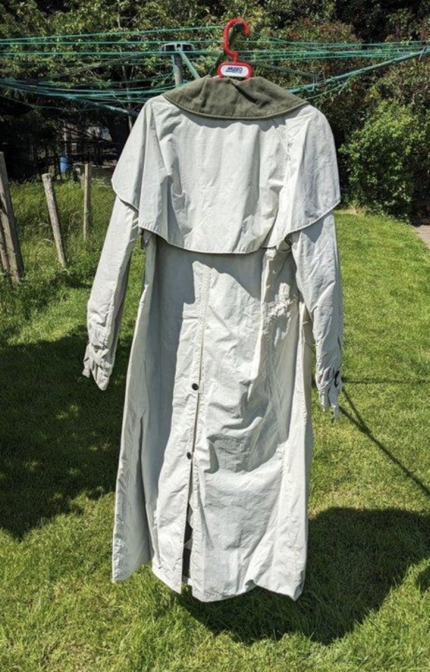 AS NewFull length 107 cmsSize 12, chest 109 cmsOlive green, suede effect with tweed effect trim.Waterproof, breathableDetachable hood, adjustable cuffs, rear riding pleat, leg straps, inside pocket, external zipped pocketsLightly padded for warmthWorn twice to dog walk.Currently selling online for £132Need the wardrobe space ONLY £85.00
