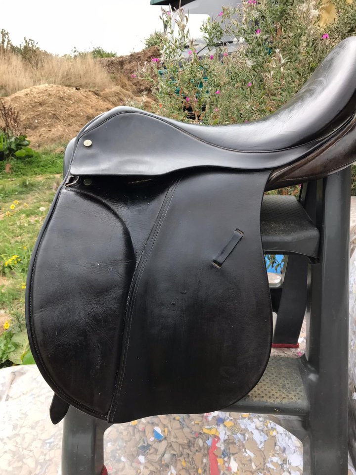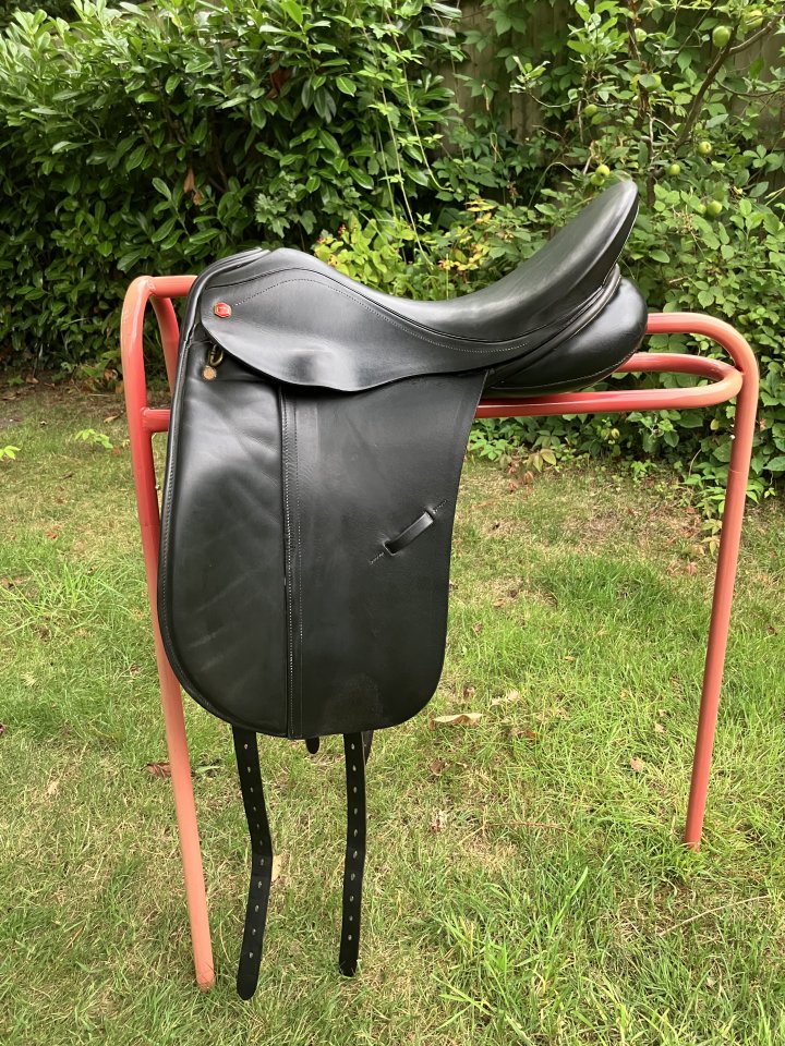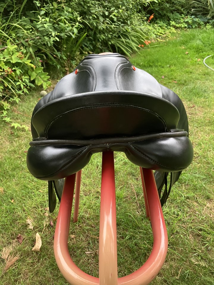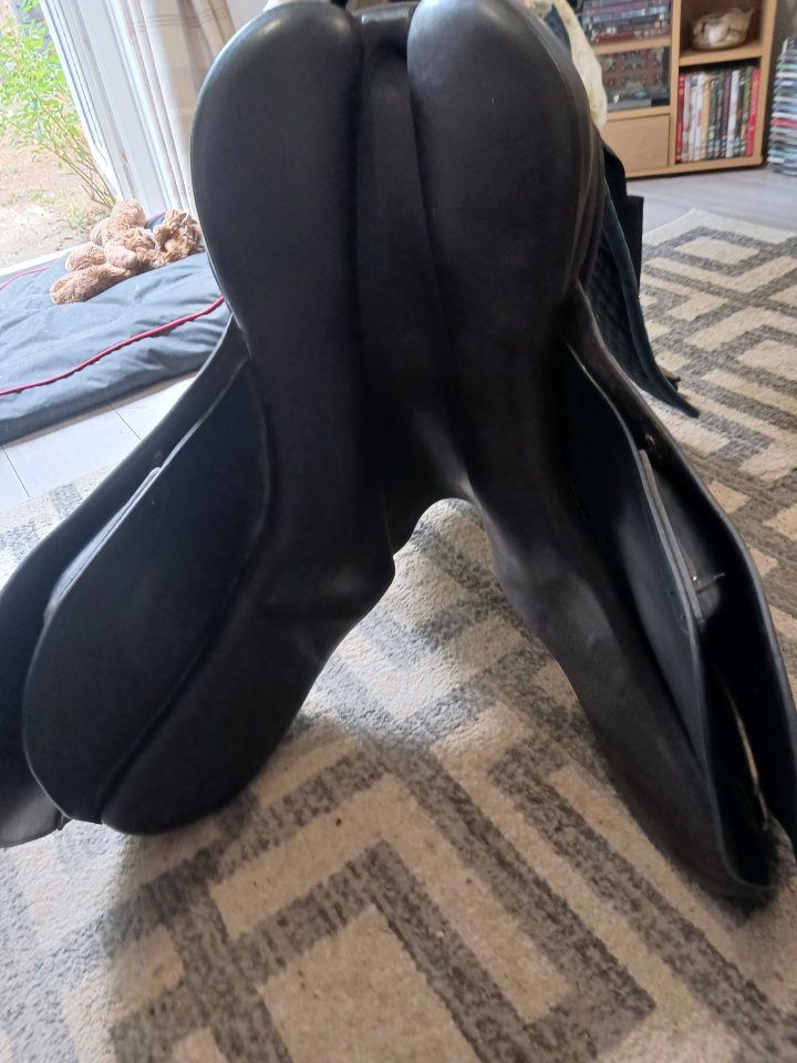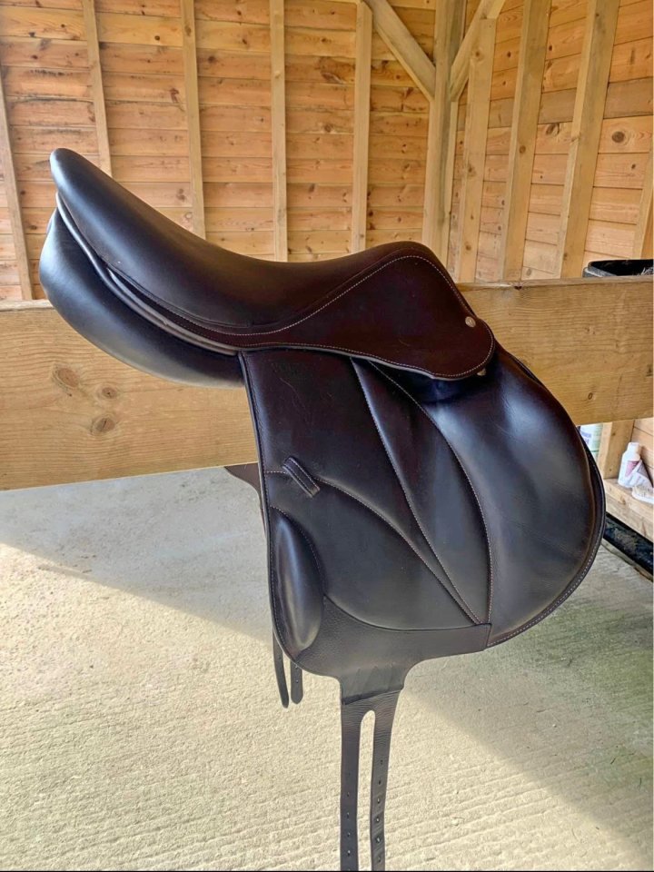 Beautiful, top quality, comfortable saddle. Cost almost £1000. Brand new still, was tried on when purchased and then stored ready for shows. Unfortunately a visiting cat gained access to the understairs cupboard where it was stored and scratched the saddle through the cover. The scratches are all cosmetic surface scratches and do not compromise the saddle - most of the scratches cant be seen once a rider is on board. NEVERTHELESS AS THE PHOTOS SHOW THIS SADDLE DOES HAVE SCRATCH MARKS.