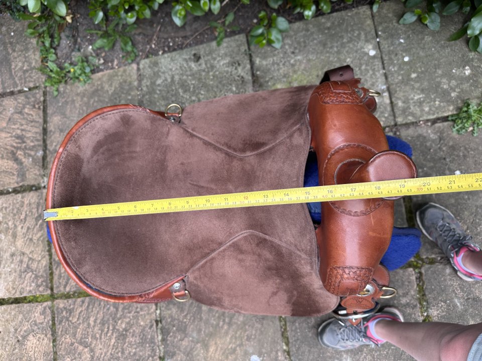 Measures 6 ½ inches between the panels at the front of the saddle with a low, open head pommel design to prevent pinching at the withers/shoulder. Also has a flat (hoop) native/cob tree.