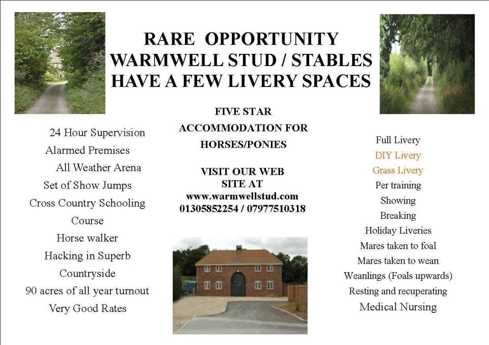 DIY only livery offered - 4.5 acres available with stabling in a quiet private yard near Shaftesbury. Suitable for 2 horses or 3 ponies. Excellent riding and outdoor school. Call Annette 07787 506523