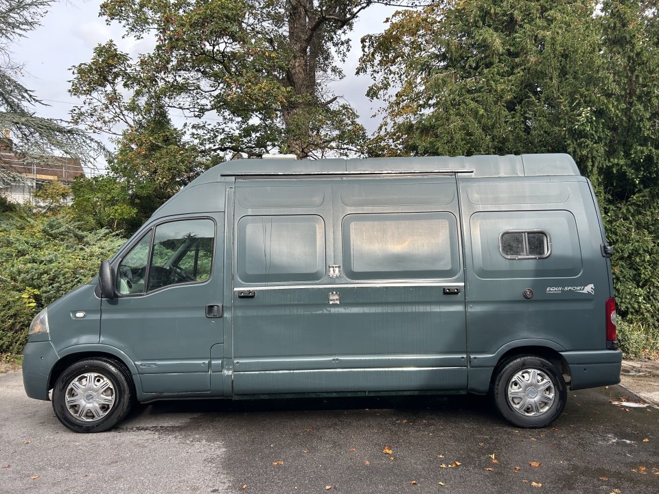 Full spec below! ⬇️ HORSE AREA: 🐴Fully reinforced 🐴Emergency size escape doors 🐴Fully rubber matted 🐴Aluminium floor 🐴Slide windows 🐴Roof vent 🐴Half wall with jockey door and collapsing breast bar 🐴EVA/rubber lined walls 🐴Luton storage 🐴Flip up top door 🐴Long stall 🐴Capable of holding 1 big horse or 2 smaller weight permitting 🐴 2 cameras, reversing and interior DAY/TACK AREA: 🐴Under seat storage 🐴Lino flooring 🐴Lighting 🐴Large Emergency escape double doors THE CAB: 🐴clean and tidy 🐴3 clean leather seats, 🐴Radio player 🐴6 speed manual 🐴Powerful 2.5dci engine, EXTERNALLY: 🐴paintwork a little dull and worn in places 🐴Tie up points