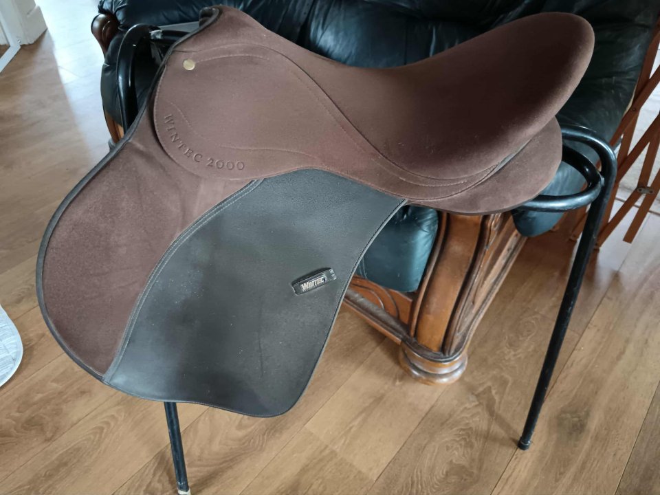 17 inch Wintec 2000 AP saddle. Brown. Good condition. Leather girth straps. Suede seat and knee rolls.