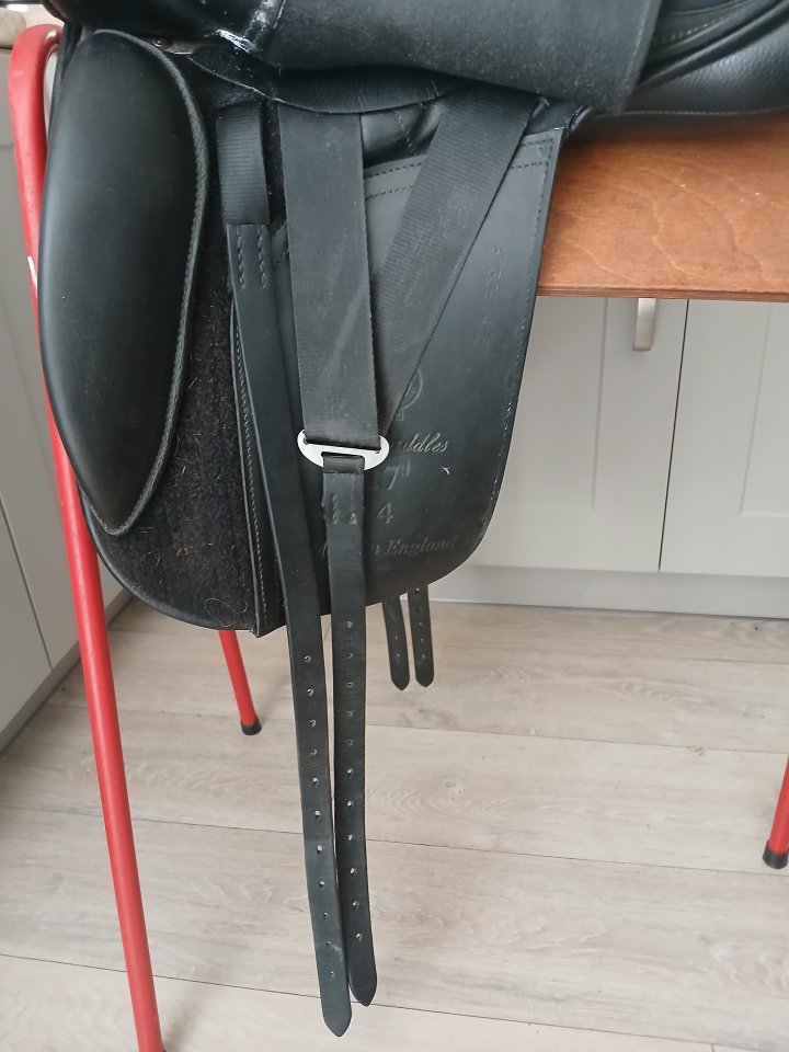 Lovely dressage saddle in excellent condition. Size 4 (Medium Wide) with buffalo leather flaps. Hardly used but sadly doesn't fit my new pony. No scratches or marks - always kept in the house. Really comfortable.£400