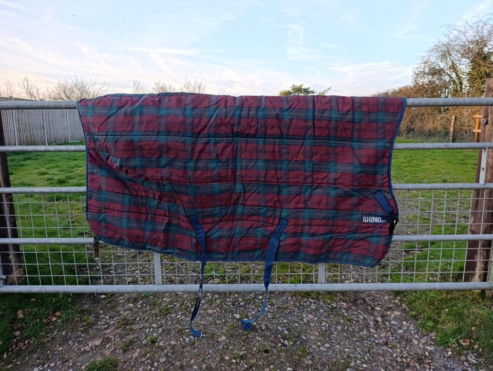 6ft3 Horseware Rhino tartan stable wug (high neck). Heavyweight. In good condition. Professionally cleaned. £10