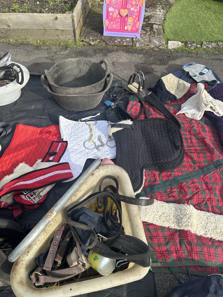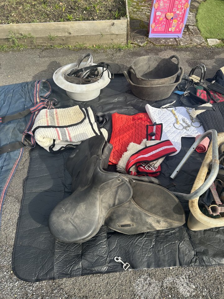 Thoroughgood synthetic saddle- needs a good clean. Shire stirrup irons Full size lunge caverson Two lunge lines Pro-lite saddle pad 5ft 9 night rug 5ft 9 New Zealand 5ft 9 waffle cooler/ travel/ stable rug Travelling gamgee and 4 burgundy bandages 6ft night rug 3 large feed / water bowls Leather girth Martingale Red numnah White high wither numnah Black, sheepskin lined numnah Corner feed buck and wall attachment Filled with miscellaneous bits of tack inc bridle, stirrup leathers headcoller etc 1 Waterford snaffle 1 roller snaffles 1 curb chain 4 red fleece bandages 1 very nice leather shaped girth Par of rubber reins 3 fly hoods ( fit 15.2 TB x WB) 1 cotton travel rug 1 Rambo stable rug 6ft excellent condition 1 medium weight 6ft stable rug excellent condition 1cotton travel rug 5ft 9 washed and in excellent condition 1 waterproof exercise sheet 1 cotton travel rug 6ft 1 heavy weight, 6ft stable rug All been stored in plastic sealed storage boxes in a very dry loft. Moving house means I need this lot gone No offers as there is a lot of money’s worth of stuff here. Collect West Moors All to go together -£200 no offers
